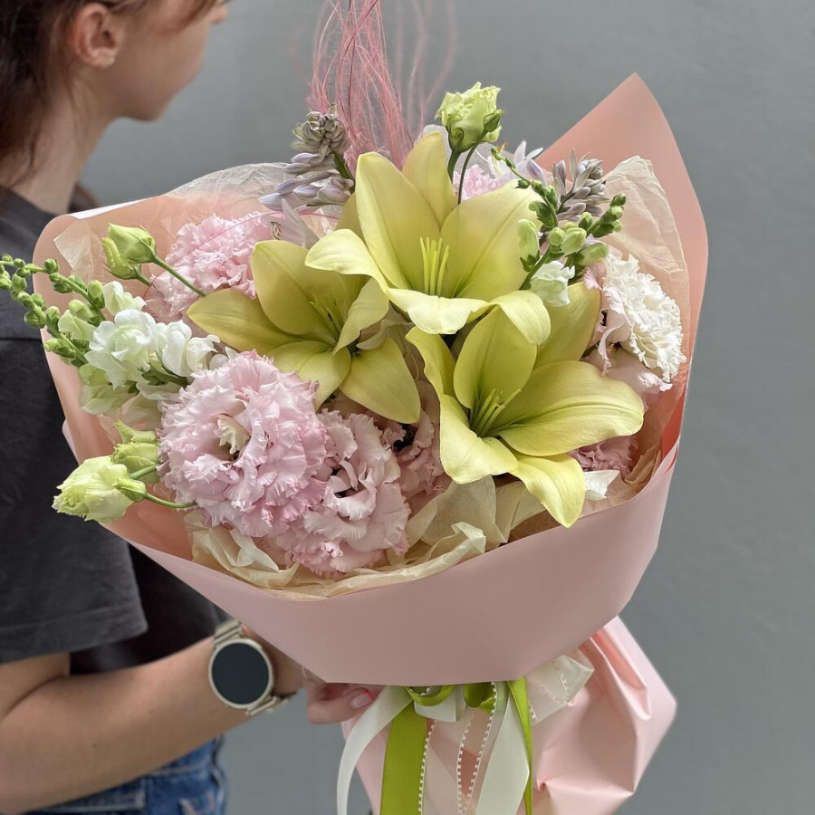 На фото букет «хрустальный луг». В составе: лилия 3 шт, эустома (лизиантус) 4 шт, зелень 3 шт, дизайнерская упаковка 1 шт, атласная лента 1 шт, . Все цветы свежие и ароматные, букет красиво оформлен и отлично подходит для подарка. Доступна доставка цветов или самовывоз.